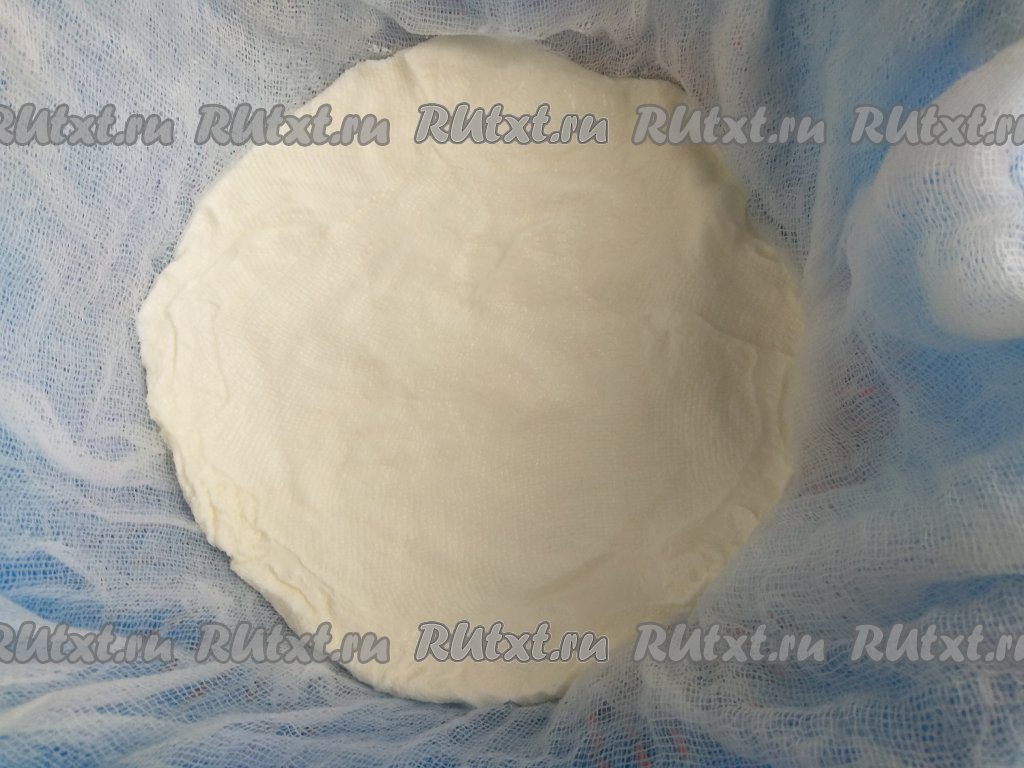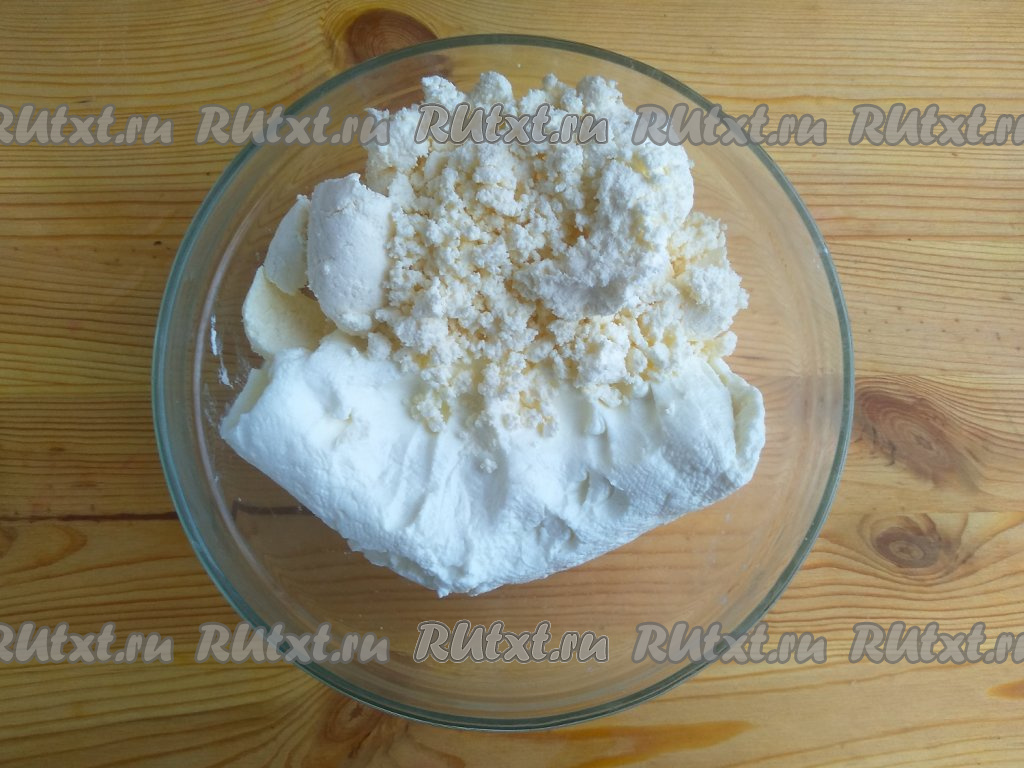 Переложить йогурт с марли в миску, туда же выложить творог.