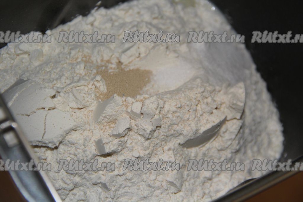 Всыпать муку и добавить сухие дрожжи, закрыть крышку хлебопечки. Выставить режим "Белый хлеб" (у меня этот режим составляет 3 часа 10 минут).