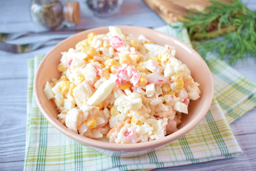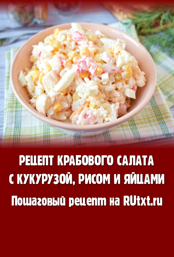Этот вариант крабового салата с кукурузой, рисом и яйцами мы очень любим и готовим его достаточно часто. В нём все ингредиенты отлично сочетаются и приятно дополняют вкусы друг друга. Салат, приготовленный по этому рецепту, выглядит достаточно ярко и всегда приятно смотрится на обеденном или праздничном столе. Попробуйте приготовить и вы!