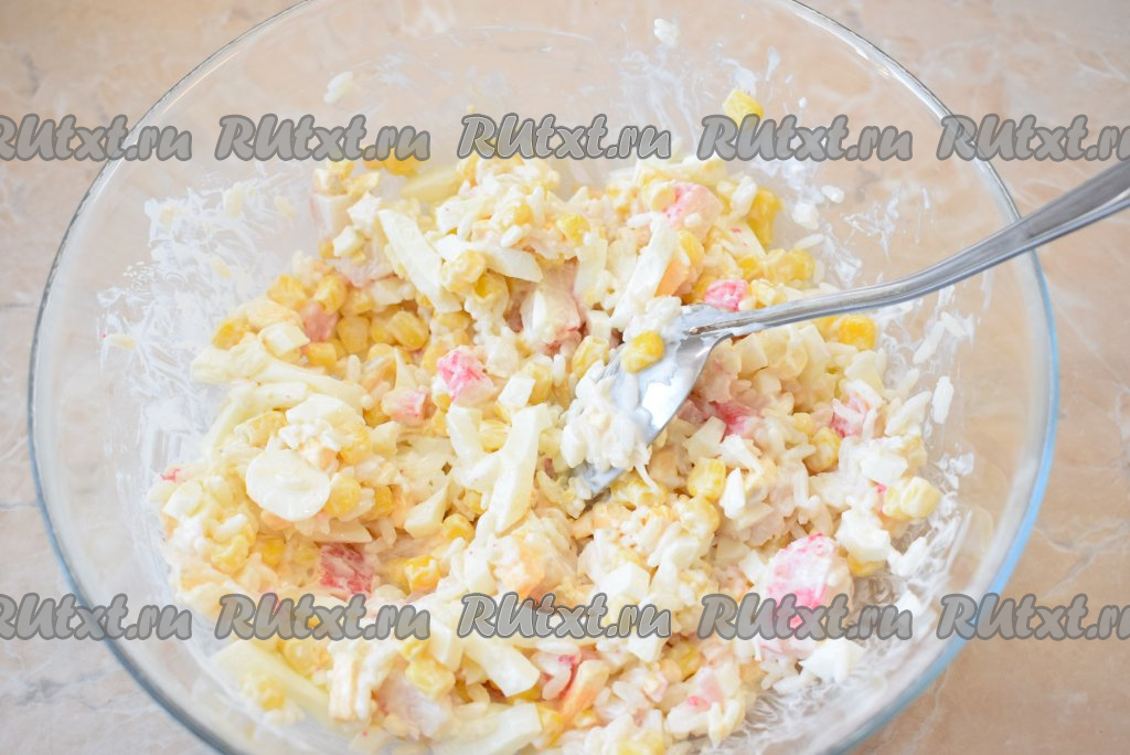 Крабовые палочки необходимо заранее разморозить. Затем нарежьте их на небольшие кусочки и добавьте в салат из риса и кукурузы.