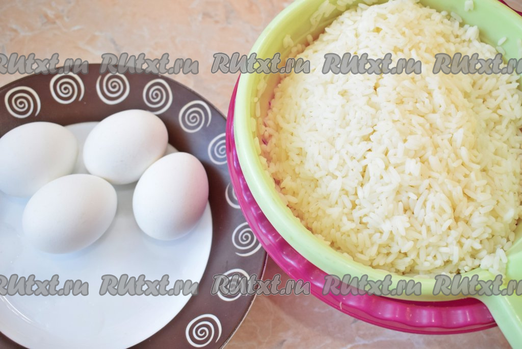 Для приготовления салата, первым делом, отварите яйца и рис. Яйца варите в кипящей воде минут 8, затем горячую воду слейте и охладите их в холодной воде.