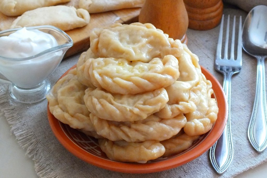 Затем возьмите одну лепёшечку, выложите на середину неполную столовую ложку картофельной начинки, соедините края теста, формируя вареник. Место соединения, по желанию, оформите "верёвочкой". Таким образом сформируйте все вареники с картошкой.