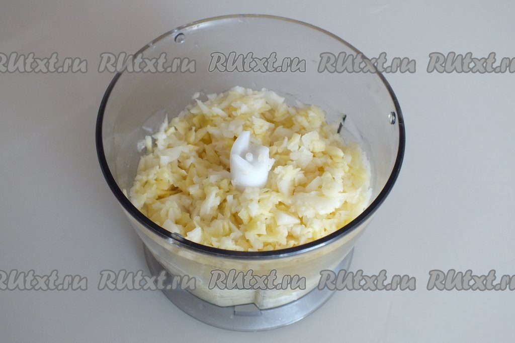 Картофель очистите, разрежьте на несколько частей, пробейте в блендере в пульсовом режиме. Картофель не должен превратиться в кашу, а скорее напоминать мелкую крошку. Если блендер у вас отсутствует, нарежьте картофель на очень мелкие кубики (ориентировочно, размером около 2 мм) или натрите на крупной тёрке.