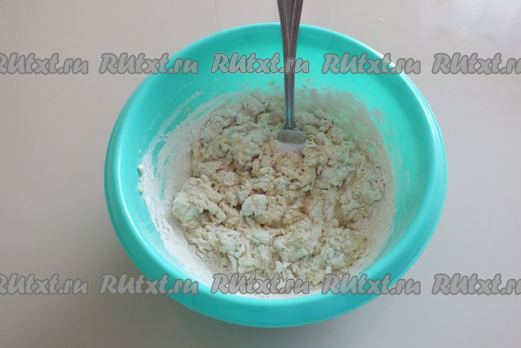 Всыпьте частями муку. Сначала перемешивайте вилкой, когда станет трудно перемешивать, месите руками.