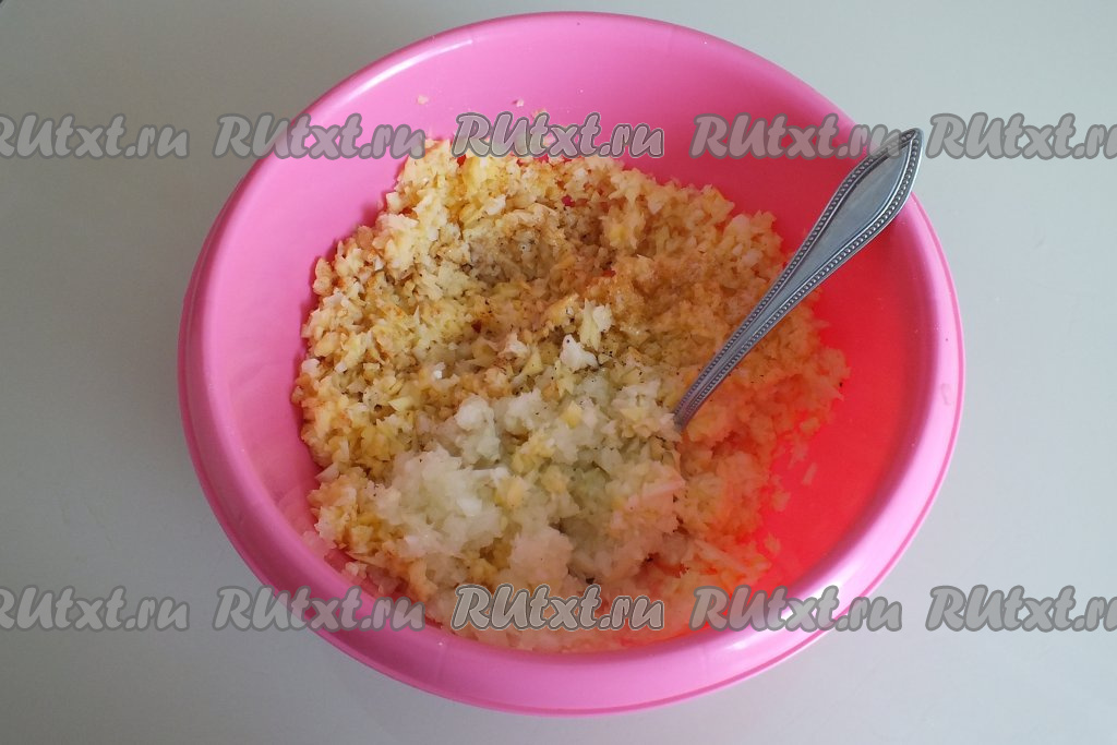 В миске смешайте измельчённые лук и картофель, добавьте 2 столовые ложки растительного масла, посолите и поперчите по вкусу, перемешайте и начинка для вареников готова.