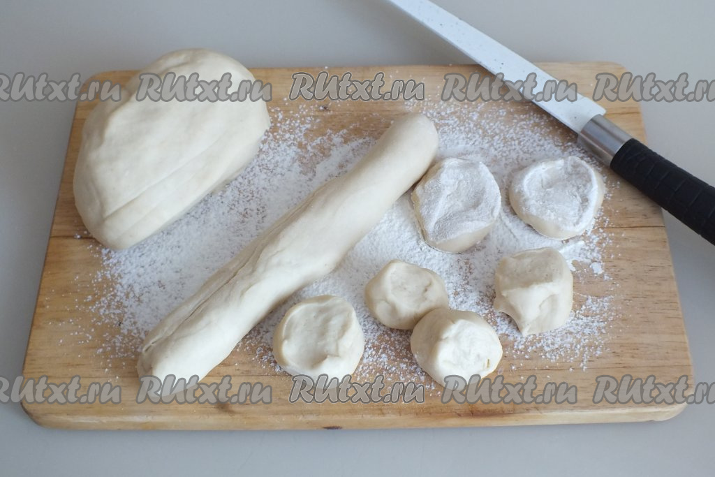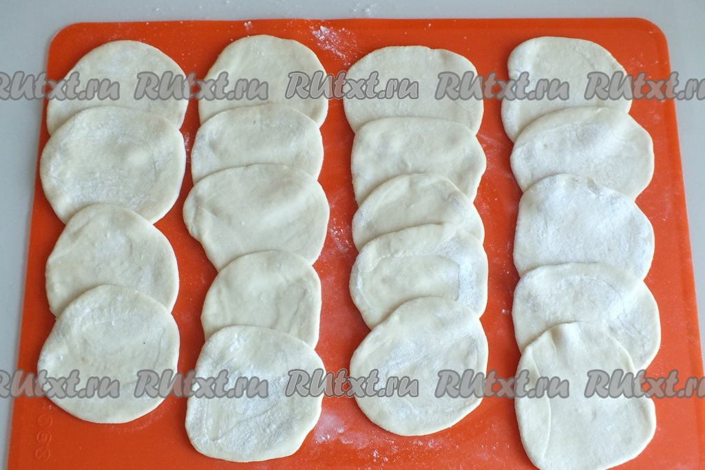 Затем каждый кусочек теста раскатайте в лепёшечку диаметром 8-9 см. Не забывайте слегка присыпать мукой.