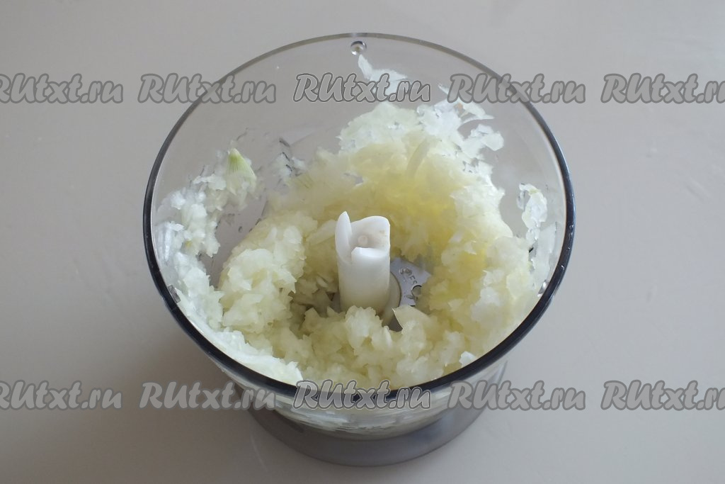 Пока тесто "отдыхает", приготовьте начинку. Начните с лука. Очистите большую луковицу, разрежьте на несколько частей и пробейте в чаше блендера почти в кашицу (или натрите на тёрке), затем переложите в миску.