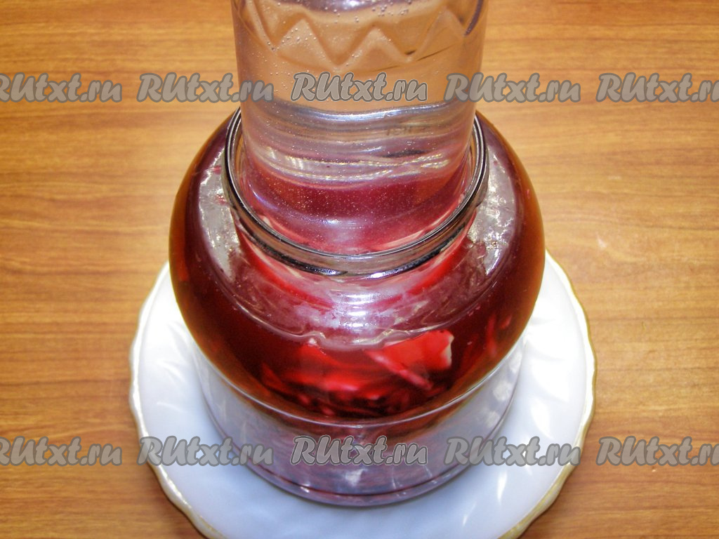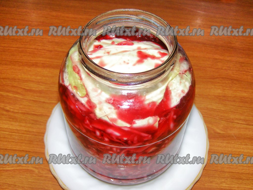 На капустные листы ставим груз (можно использовать бутылку с водой), можно накрыть марлей, чтобы в банку не попадала пыль. Оставляем капусту со свеклой кваситься на 3 дня при комнатной температуре.