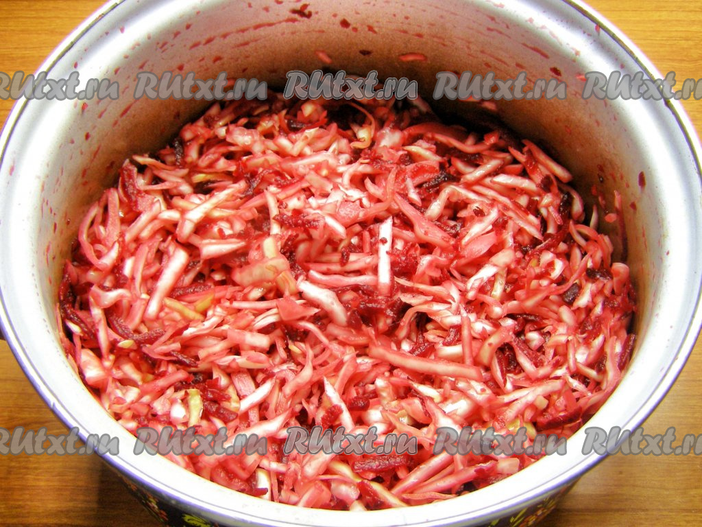 Перемешиваем капусту со свеклой и солью, немного мнём руками. Сильно мять не советую, потому что капуста может получиться мягкой и не будет хрустеть.