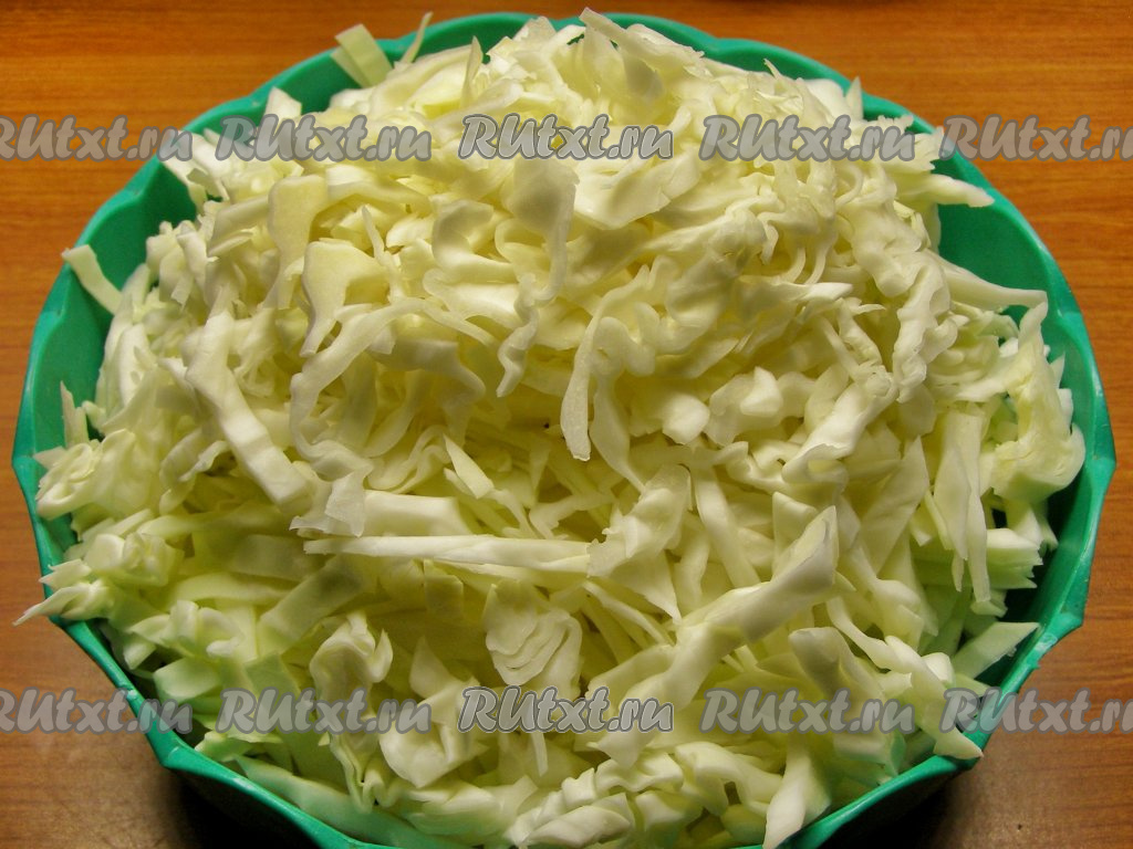 С капусты снимаем верхние и испорченные листья, споласкиваем её тёплой водой и просушиваем бумажным полотенцем. Пока вы не начали резать капусту, снимите с неё несколько чистых крупных листьев - они нам пригодятся немного позже. Нарезаем капусту достаточно тонкими полосочками, примерно, по 5 мм толщиной.