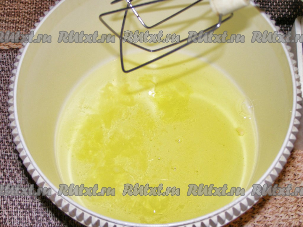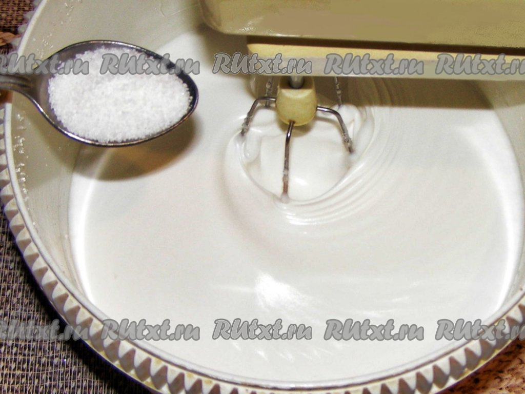 Постепенно скорость увеличиваем и продолжаем взбивать. Когда белок увеличится в объёме, не прекращая взбивать, всыпаем в чашу миксера сахар тонкой струйкой и продолжаем взбивать до полного растворения сахара (на это потребуется 8-10 минут).