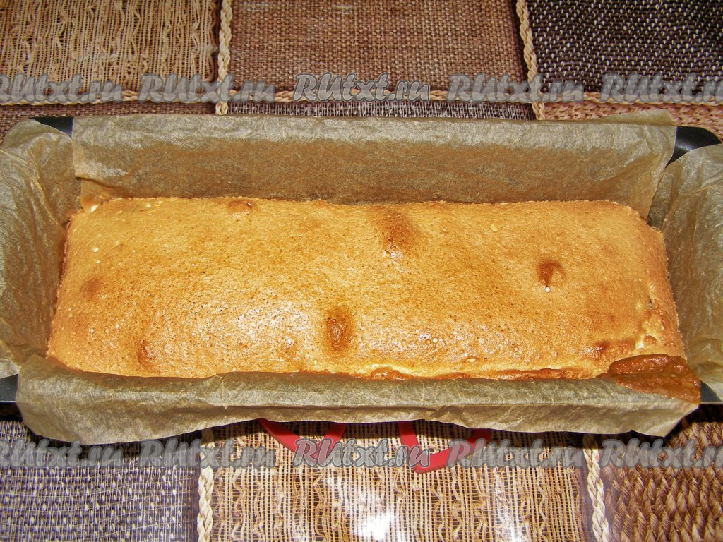 Достаём форму с кексом из духовки, вынимаем его из формы и оставляем остывать, накрыв полотенцем. Вкусный, мягкий и ароматный кекс, замешанный на яичных белках, нарезаем на кусочки и подаём к столу к чаю или кофе.