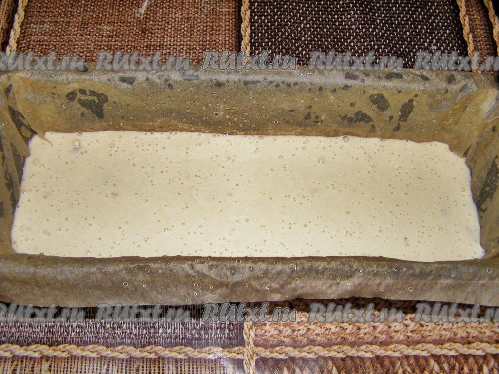 Застилаем форму для выпечки кекса пекарской бумагой, слегка смочив её холодной водой. Выливаем в форму тесто.