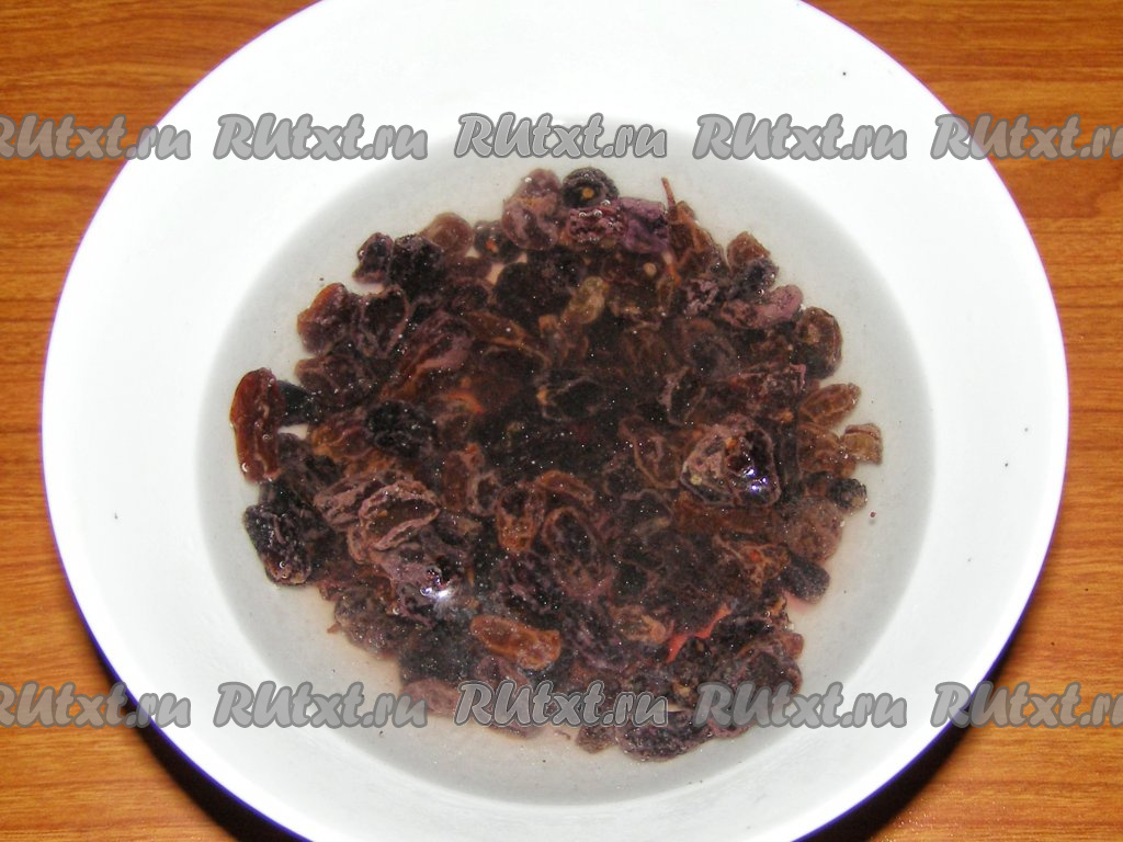 Сначала перебираем изюм и тщательно его промываем. Если изюм сухой, то его нужно замочить, примерно, минут на 30 в горячей кипячёной воде.