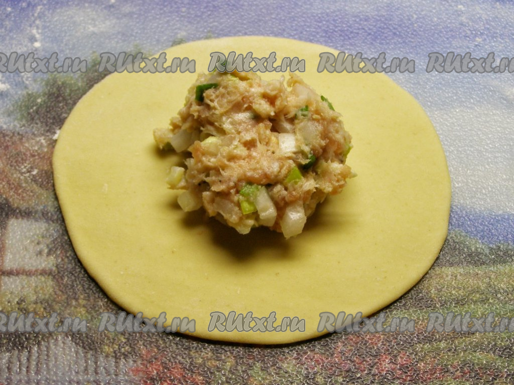 В середину каждого раскатанного кусочка теста кладём, примерно, 1 столовую ложку свиного фарша с луком.