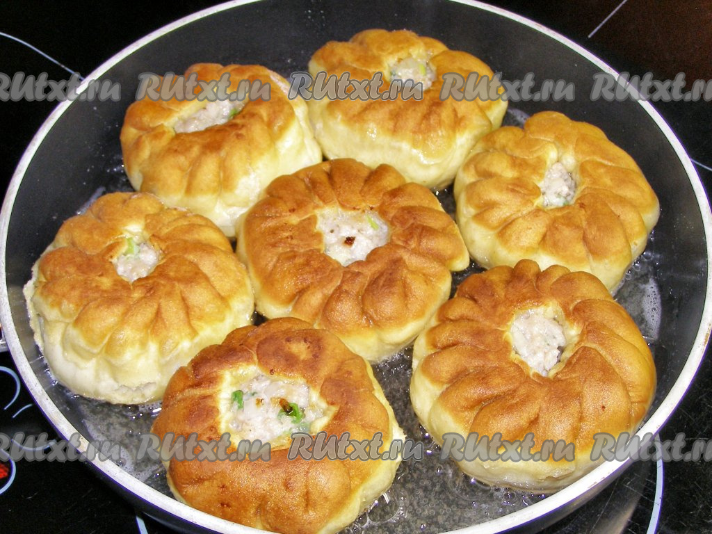 В сковородку наливаем масло и на сильном огне раскаляем его. Выкладываем в сковородку беляши отверстием вниз. Масло в сковороде должно доходить до середины беляшей. Обжариваем, примерно, 3-4 минуты (до образования золотисто-коричневой корочки) на среднем огне.