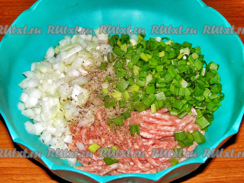 Свинину перекручиваем на мясорубке, перекладываем фарш в миску, добавляем репчатый и зелёный лук, соль (я добавила адыгейскую) и чёрный свежемолотый перец. Тщательно перемешиваем фарш руками.