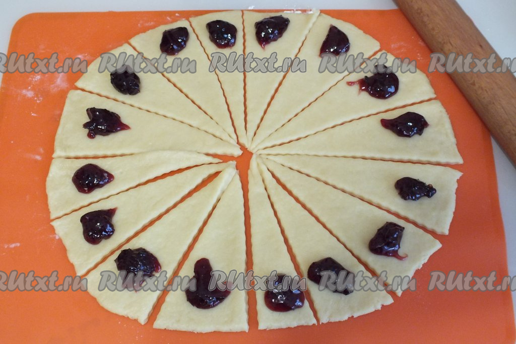 На середину ближе к широкому краю каждого сектора выложите по 1/4 чайной ложки повидла.