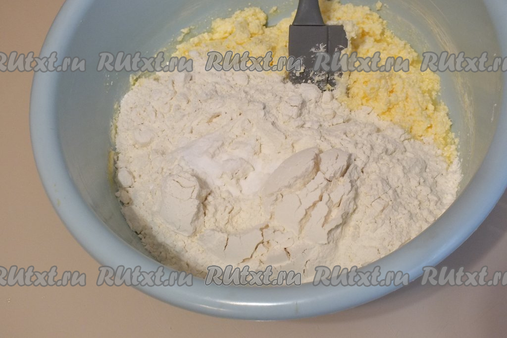 Тесто будет собираться в комочки. Подсыпайте частями оставшуюся муку, перемешивая лопаткой.