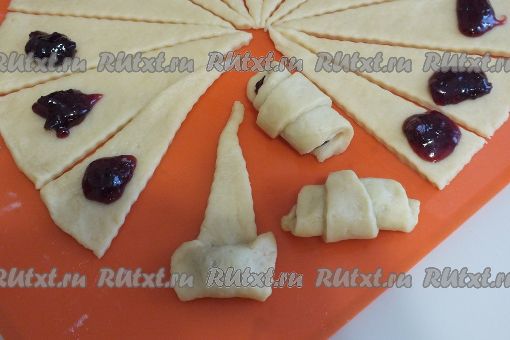 Каждый сектор, начиная с широкого края, сверните в рогалик (для формирования рогалика прикройте широкой частью сектора начинку, слегка прижмите края и скрутите тесто).