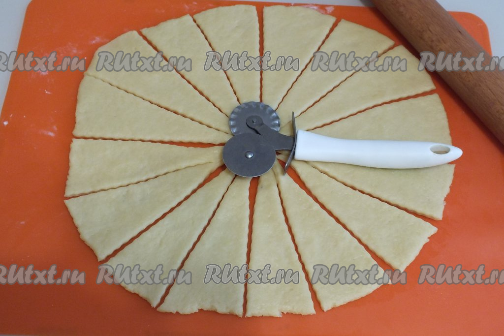 На припылённой мукой поверхности каждую часть теста раскатайте в круг толщиной 0,5 см. Каждый круг разрежьте на 16 (или 8) секторов. Мне нравятся маленькие рогалики, поэтому я разрезала на 16 секторов.