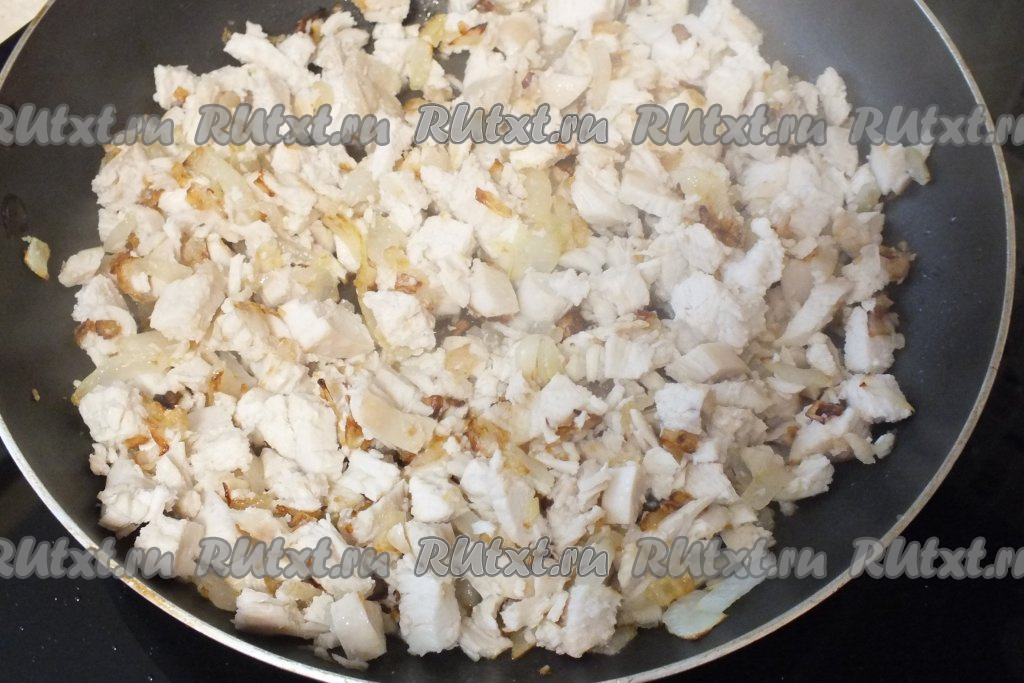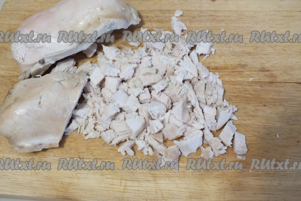 Остывшее куриное мясо нарежьте на небольшие кубики размером, примерно, 0,5 см на 0,5 см.