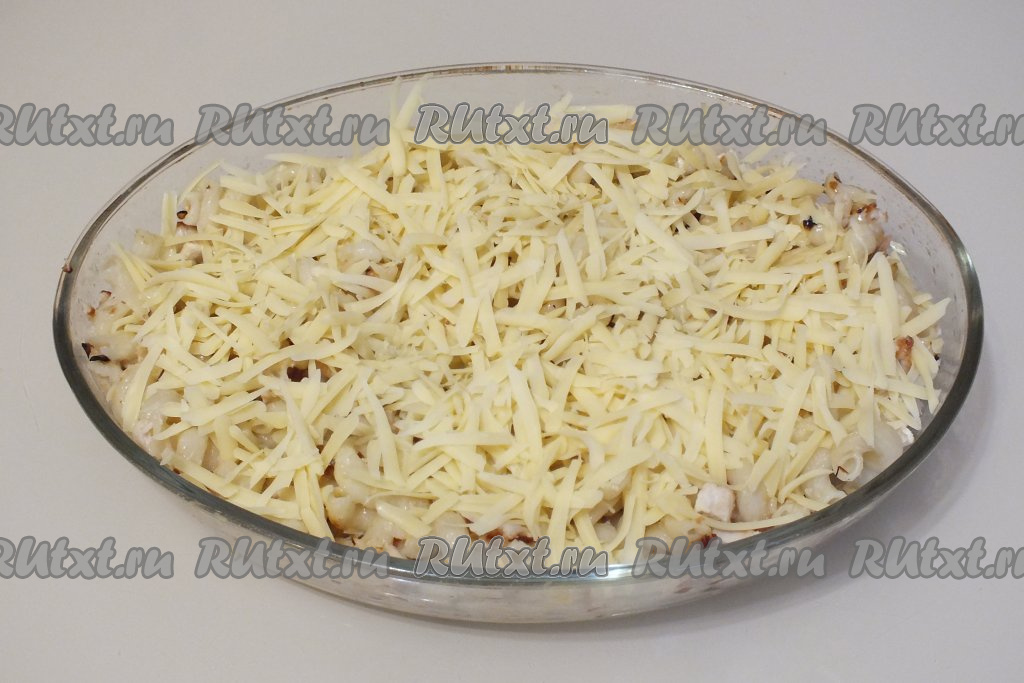 Сверху присыпьте натёртым сыром. Поставьте форму с запеканкой из макарон с курицей и сыром в разогретую до 190 градусов духовку на 20-25 минут (до появления лёгкой румяной корочки).