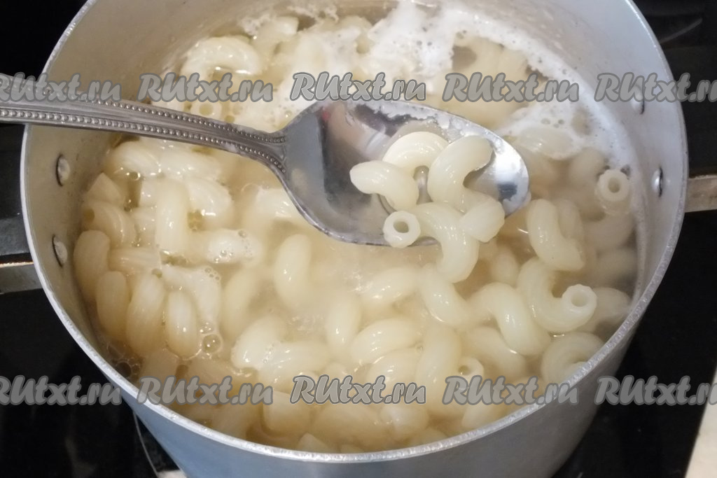 Макароны выложите в кипящую подсоленную воду, добавьте 2 столовые ложки растительного масла, дайте закипеть, а затем варите до готовности на небольшом огне в соответствии с инструкцией на упаковке (обычно на варку требуется 7-10 минут). Следите, чтобы макаронные изделия не переварились. Готовые макароны откиньте на дуршлаг и дайте стечь жидкости.