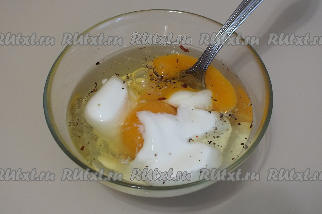 Сделайте заливку для запеканки, для этого сырые яйца, сметану, соль и специи хорошо перемешайте с помощью вилки.