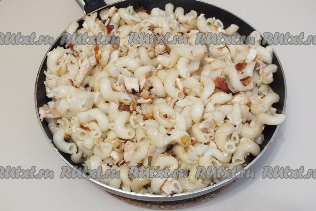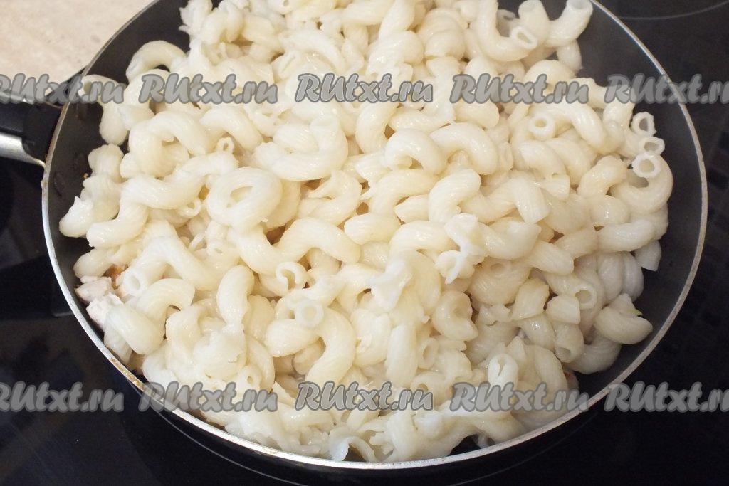 Снимите с огня. На этом этапе макароны с курицей и луком можно остудить и заморозить, а при случае немного разогреть в микроволновке, сделать заливку и поставить запекаться в духовку.