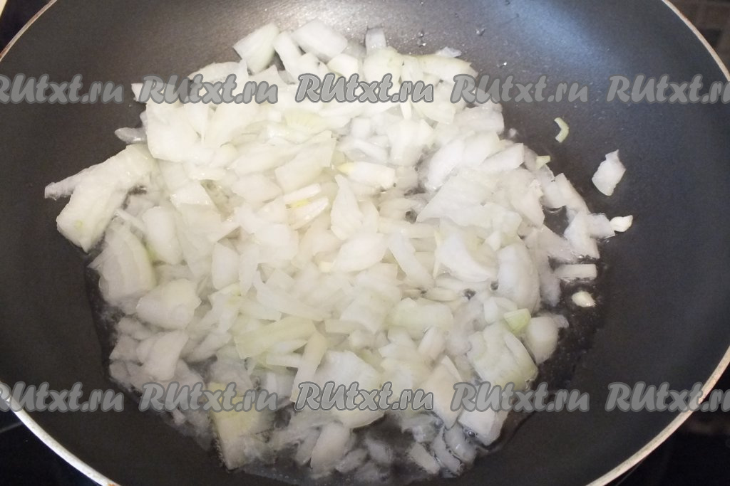 В сковороде разогрейте 50 мл растительного масла. Переложите в сковороду лук и обжаривайте на среднем огне в течение 7 минут, иногда помешивая.