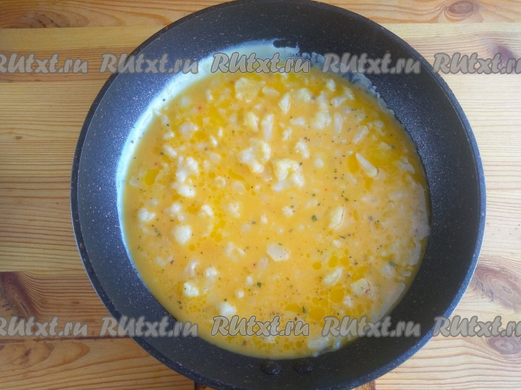 Вылить яично-молочную смесь вместе с цветной капустой. Сковороду накрыть крышкой и готовить омлет 1-2 минуты на сильном огне. После огонь уменьшить до минимального и продолжать готовить в течение 15 минут.