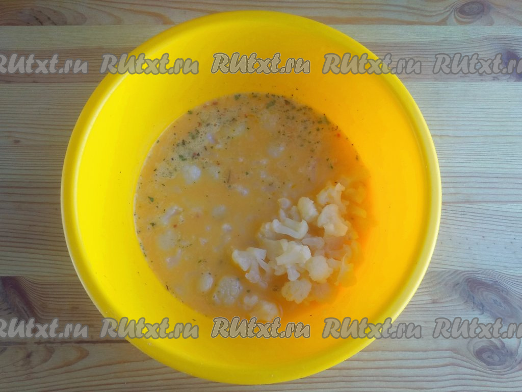 Соцветия откинуть на дуршлаг, дать стечь отвару. Немного остудить цветную капусту. Выложить соцветия в яично-молочную смесь, перемешать.
