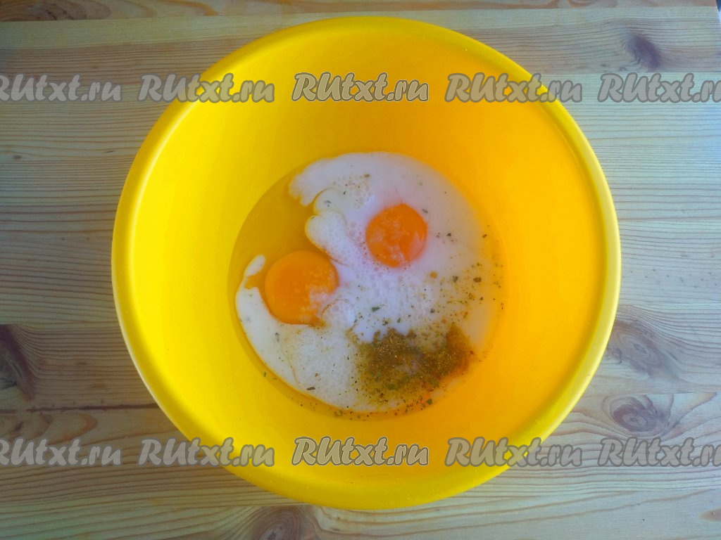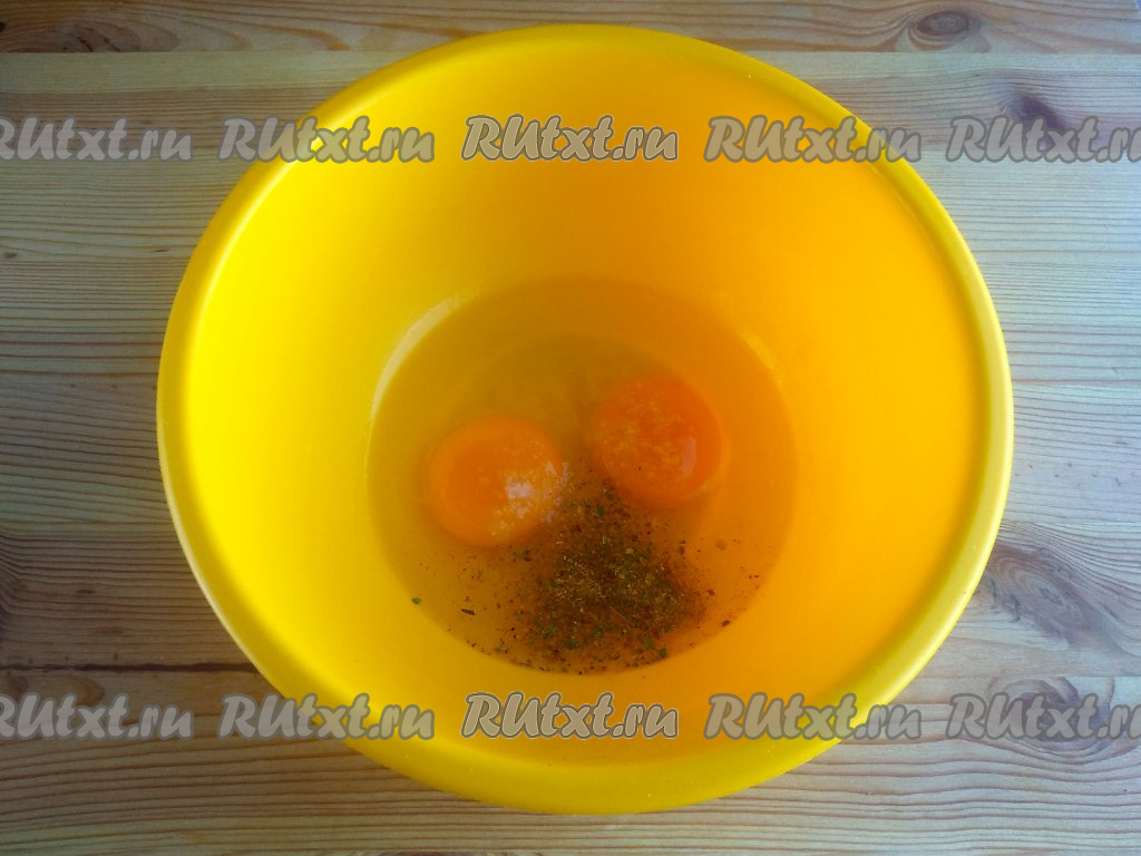 Яйца разбить в миску, добавить соль по вкусу и, по желанию, смесь специй для омлета.