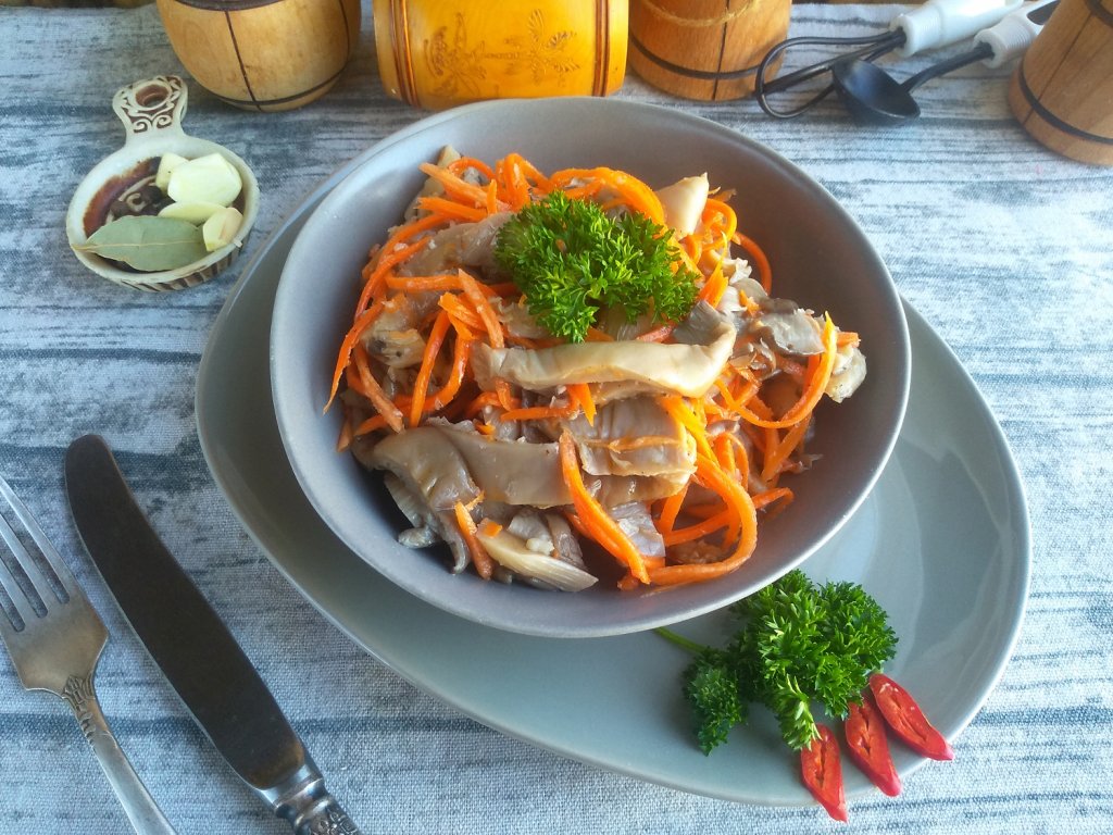 Всем любителям азиатских вкусов предлагаю приготовить вешенки с морковью по-корейски по этому рецепту. Пряная, вкусная закуска готовится из простых, доступных продуктов, великолепно сочетается с мясными, рыбными блюдами, различными гарнирами. Подать её можно не только к повседневному, но и к праздничному столу. Для этого блюда предпочтительнее брать яблочный или обычный уксус 9%. Уверена, вкус вешенок с морковью, приготовленных по-корейски, понравится многим!