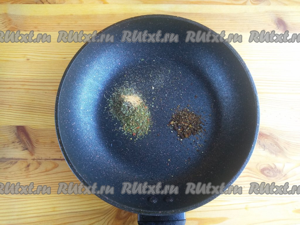 2 горошины душистого перца, 2 горошины можжевельника и бутоны гвоздики растолочь в ступке, а затем вместе с хмели-сунели, пажитником и тимьяном выложить в сковороду, влить растительное масло и нагреть смесь на среднем огне в течение 3-4 минут, помешивая.