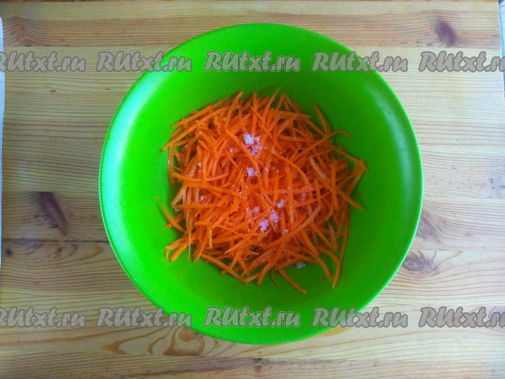 Морковь очистить от кожуры, натереть на тёрке для корейской моркови, выложить в миску, добавить соль и сахар.