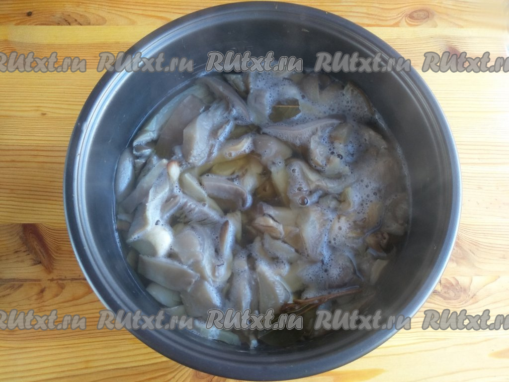 Вешенки выложить в кастрюлю, полностью залить кипящей водой, добавить лавровые листья, по две горошины душистого перца и можжевельника, поставить на огонь, дать закипеть, а затем варить грибы на небольшом огне в течение 7 минут.