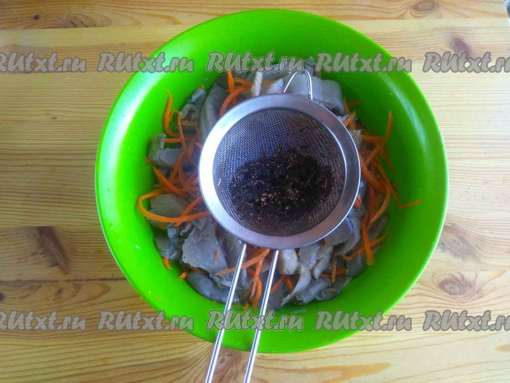 По истечении времени отвар из кастрюли слить, вешенки полностью остудить. Выложить грибы к моркови, добавить уксус, перемешать.