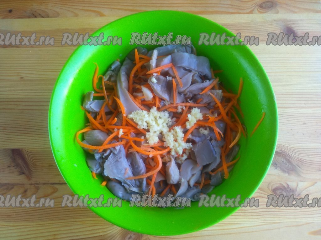 Чеснок очистить от шелухи, пропустить через пресс и выложить по центру салата.