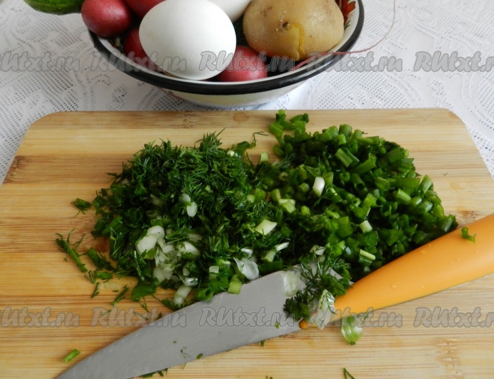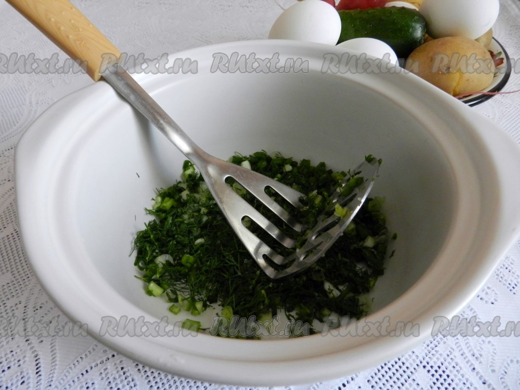 Мелко нарезать зеленый лук и укроп.