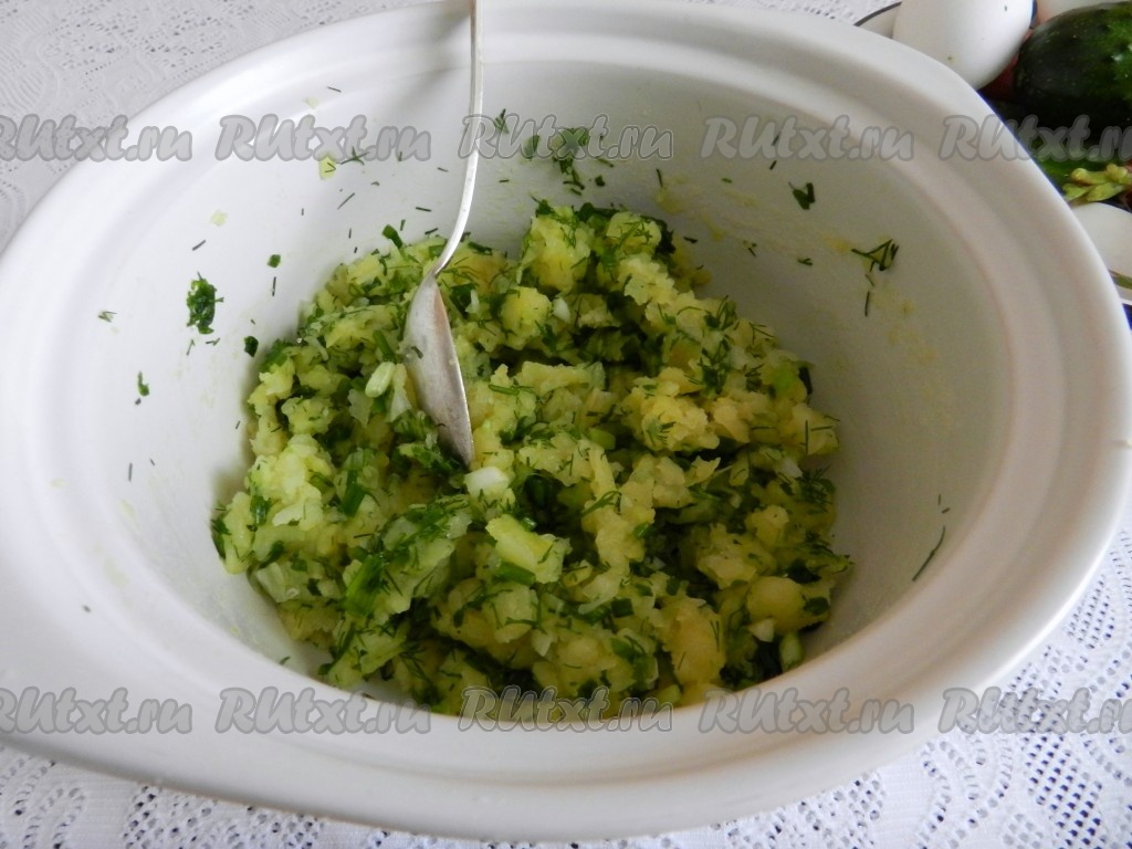 Картофель натереть на терке, перемешать с зеленью.
