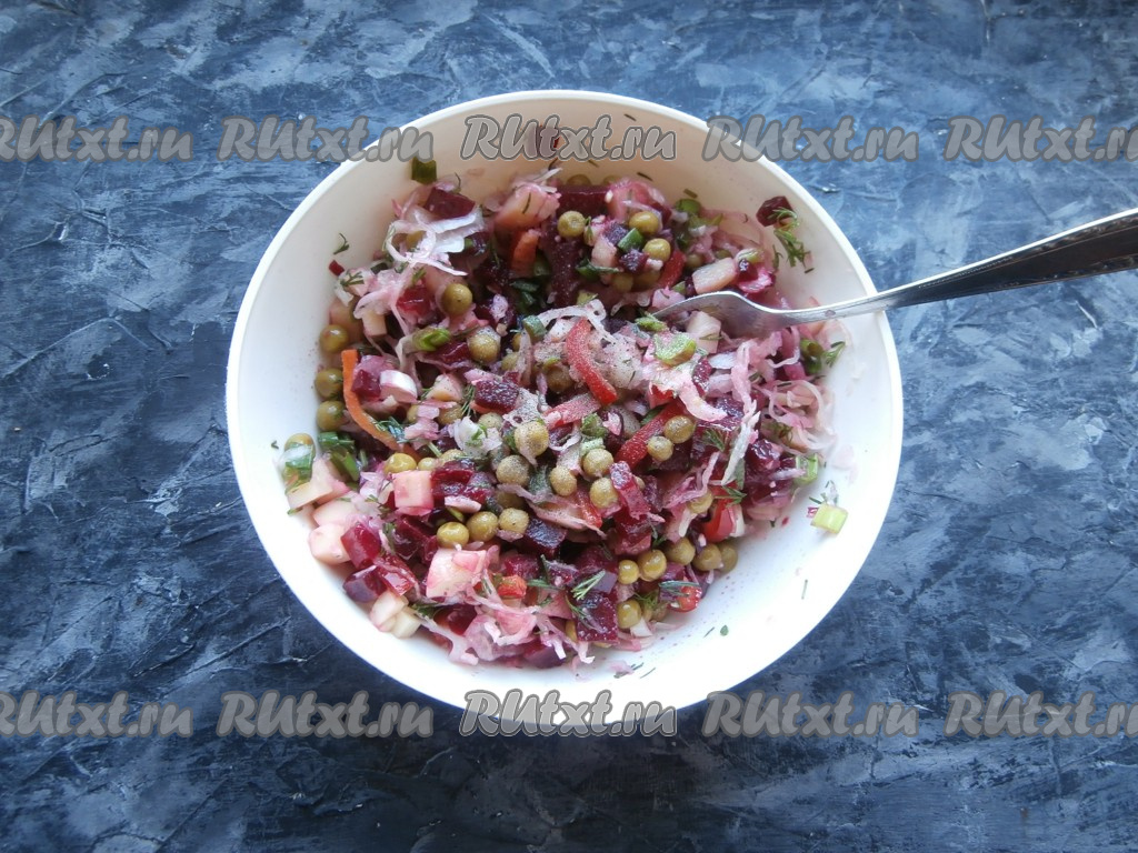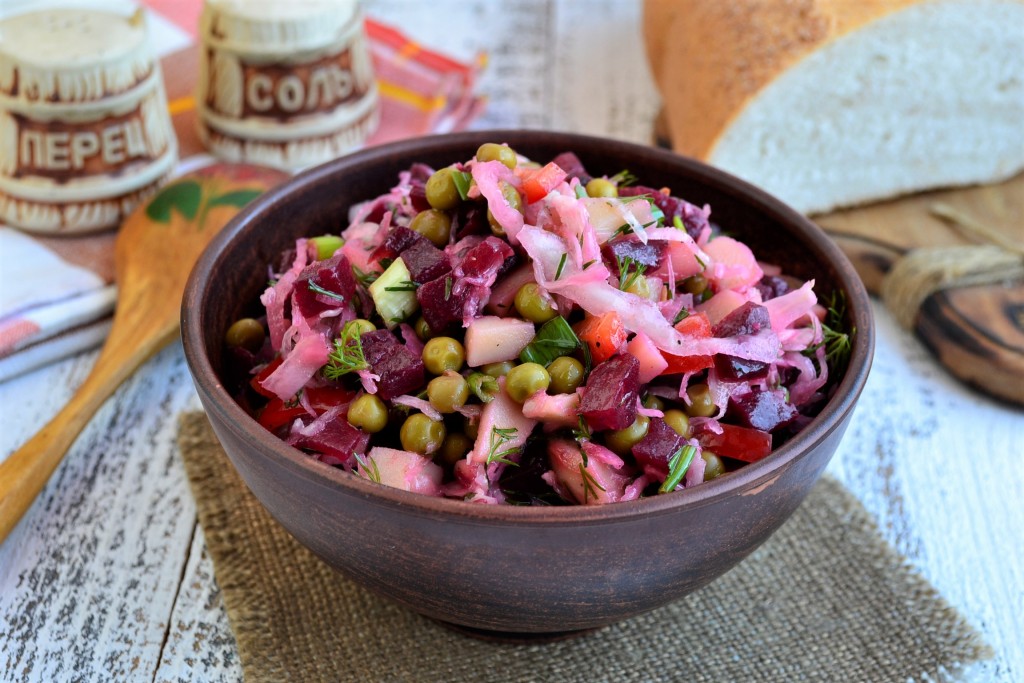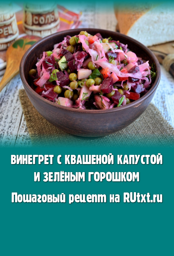 Хочу предложить вам для повседневного стола простой рецепт винегрета, который готовится с квашеной капустой и зелёным горошком. Благодаря добавлению консервированного горошка, блюдо выглядит более ярко и приобретает интересные вкусовые нотки. Сытный, полезный, вкусный винегрет можно готовить по этому рецепту и в Пост. Подать его можно на обед или ужин, он хорош как в самостоятельном виде, так и в качестве гарнира к мясу, курице или рыбе.