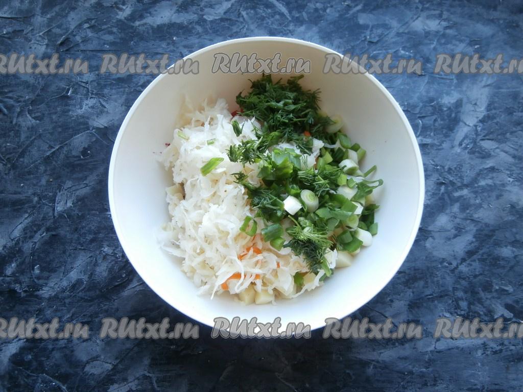 Затем добавить в миску квашеную капусту, измельчённый зелёный лук (если нет зелёного лука, можно мелко нарезать очищенный репчатый лук) и укроп.