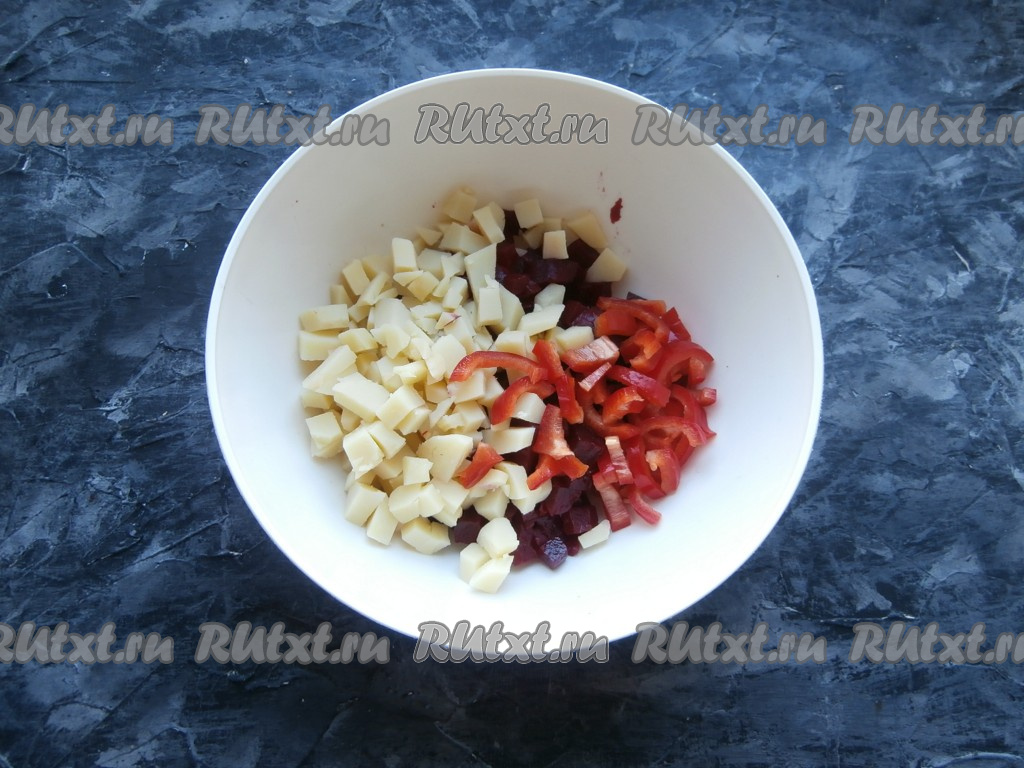 Предварительно нужно отварить свеклу в кожуре (в течение минут 45-50 с начала кипения воды) и картофель в кожуре (на его варку потребуется 25-30 минут с момента закипания воды), остудить сварившиеся овощи и очистить. Свеклу нарезать небольшими кубиками и выложить в миску.