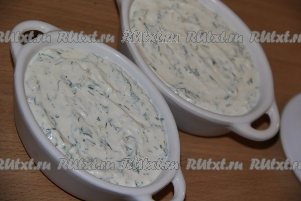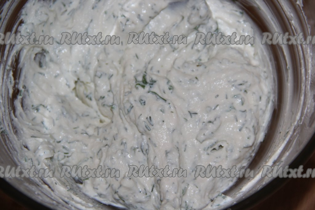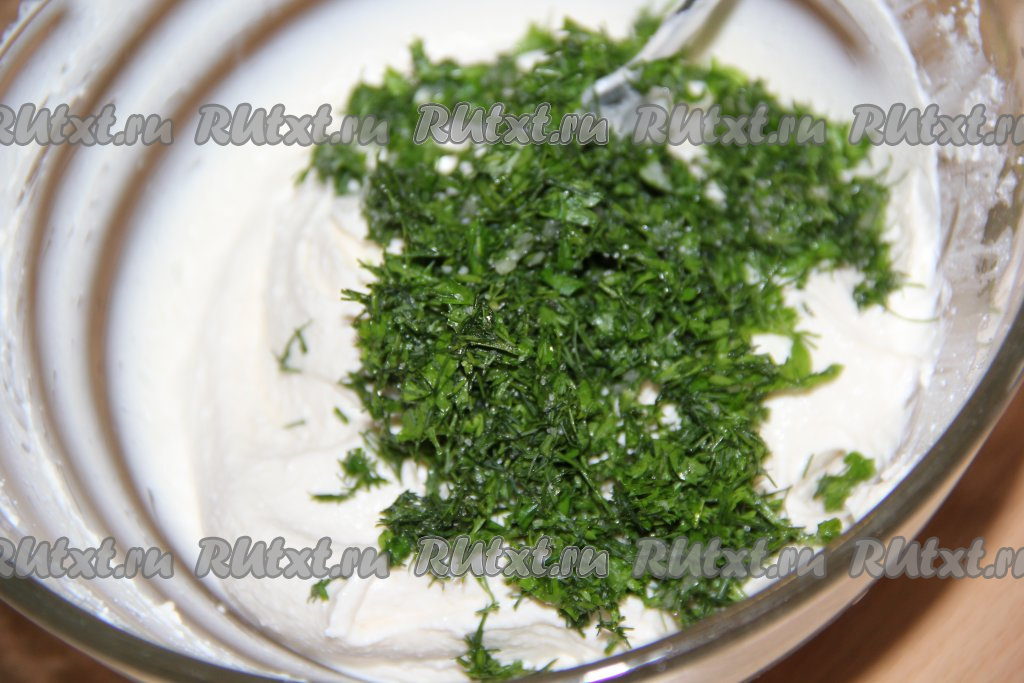 В творожную массу добавить зелень, смешанную с солью и чесноком.