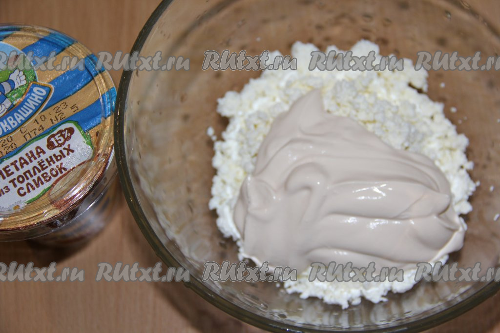 Соединить творог и сметану (я использовала сметану жирностью 15%, можно взять и домашнюю сметану).