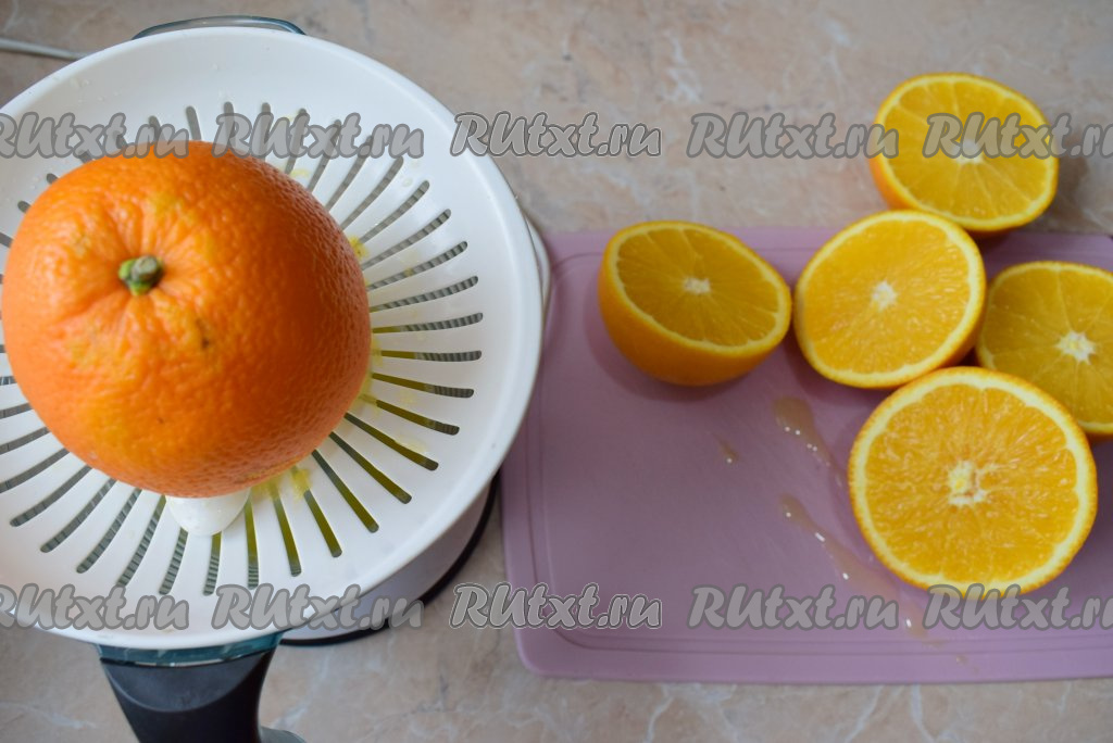 Первым делом выжмите сок из апельсинов, чтобы получилось 300 мл. Обычно для этого хватает 3 апельсинов. Если апельсины маленькие и сока вышло немного меньше, то долейте воду до нужного объёма. Свежевыжатый апельсиновый сок можно процедить через сито.