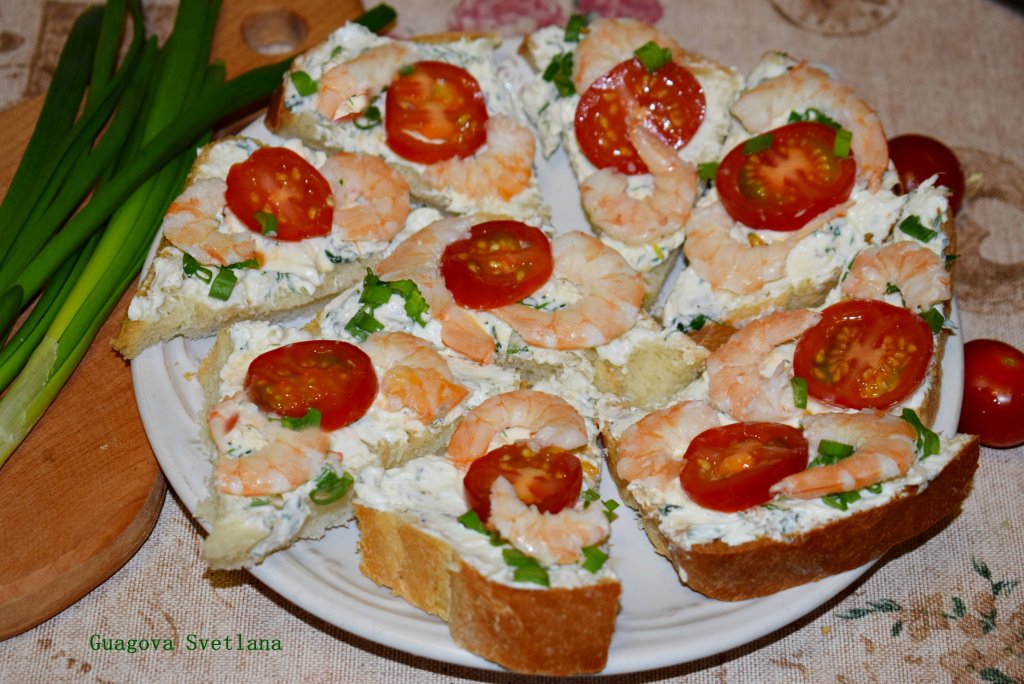 Раскладываем очищенные креветки по краям бутербродов. Наша замечательная закуска готова. Бутерброды получаются вкуснейшими, творожная намазка чудесно пахнет зеленью и чесноком, помидор черри придаёт сочность и цвет, а креветки, являясь изюминкой этого блюда, выглядят очень аппетитно! Приготовьте бутерброды с творожным сыром и креветками по этому рецепту и вы обязательно их полюбите!