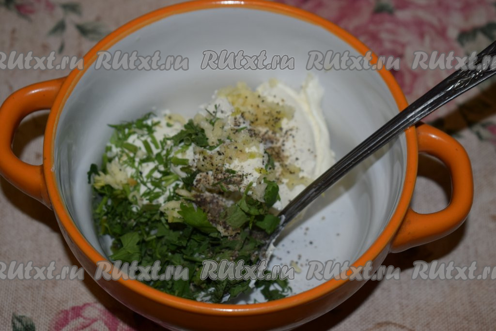 Теперь приготовим творожную намазку для бутербродов, для этого в пиалу выкладываем творожный сыр, майонез, измельчённую зелень, добавляем соль и чёрный молотый перец по вкусу, сюда же выдавливаем зубчик чеснока через чеснокодавилку.